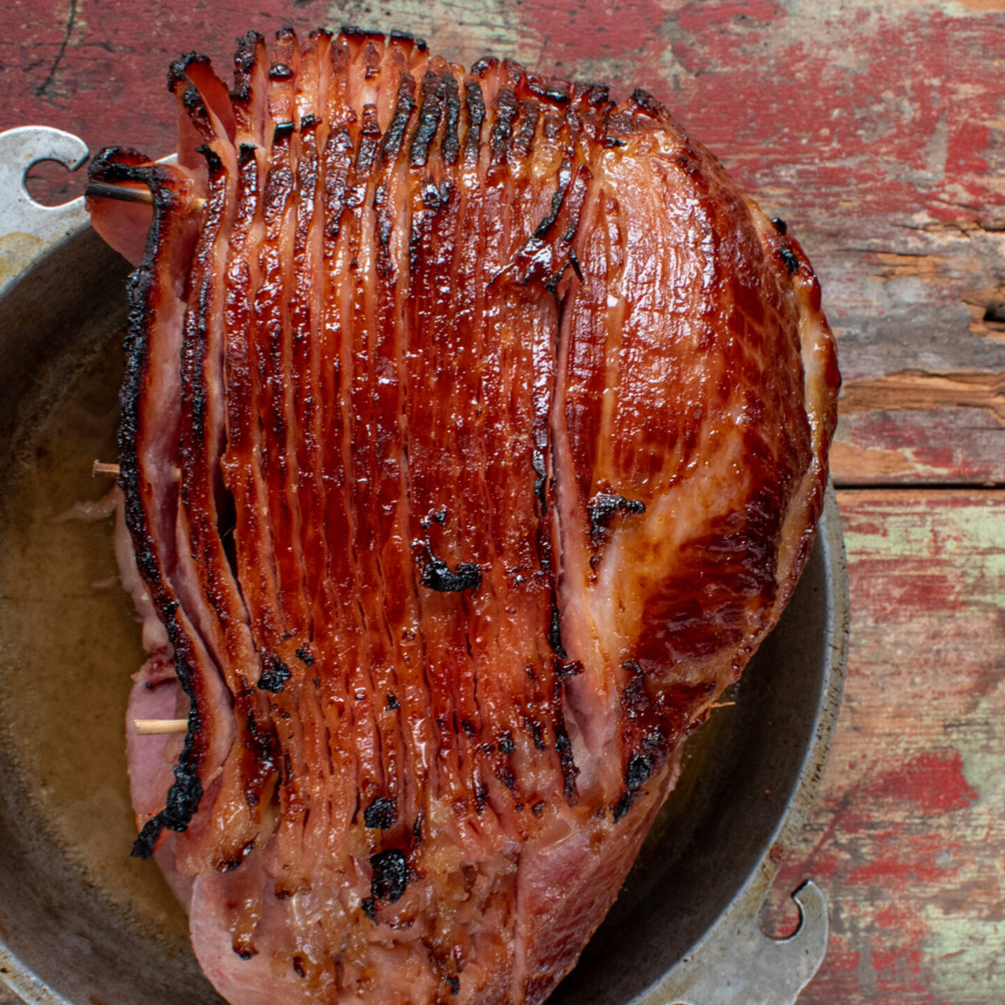 Bake: Roast the ham, basting occasionally, for about 10 minutes per pound until the internal temperature reaches 120°F and the outside is deep golden brown and caramelized. If needed, increase the oven to 450°F to deepen the color — watch it closely at this stage.